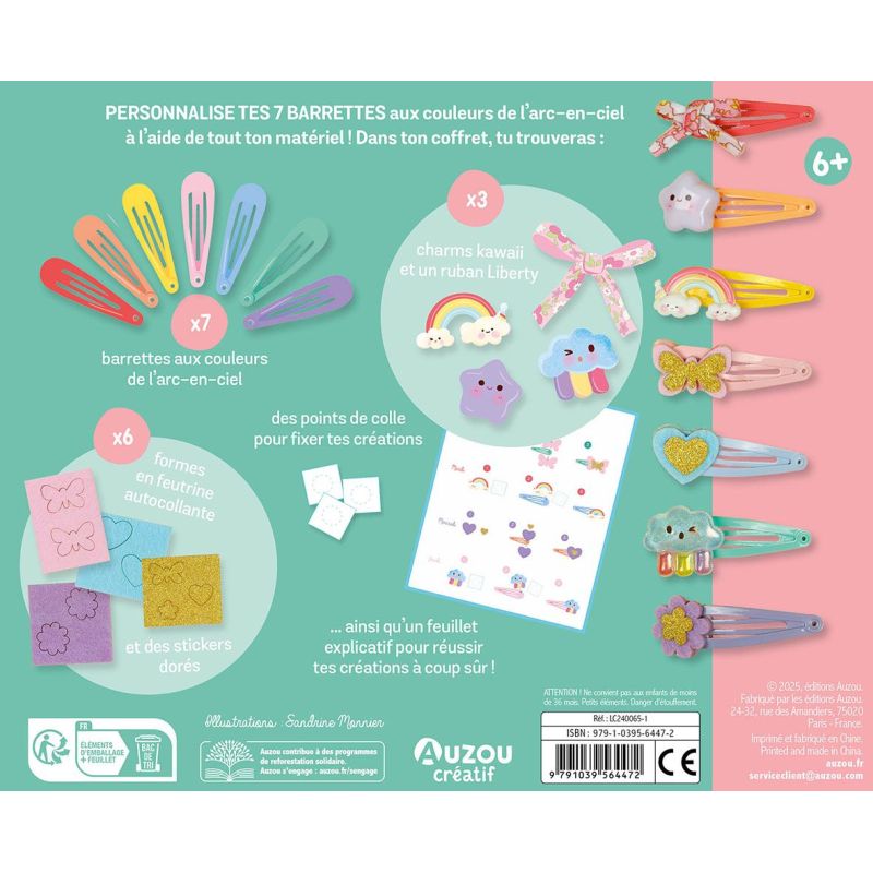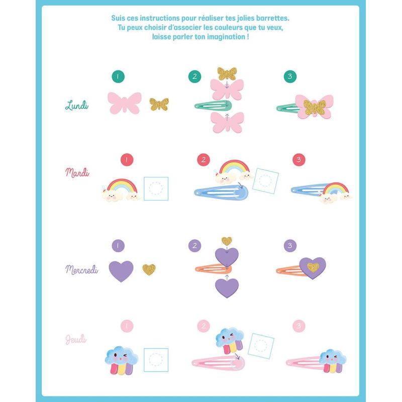 Un semainier de 7 barrettes à réaliser, pour orner ses cheveux d'une création différente à chaque jour de la semaine ! Les 7 supports sont de 7 couleurs différentes. Rubans, feutrine, charms fantaisie... les modèles sont aussi variés que tendance !