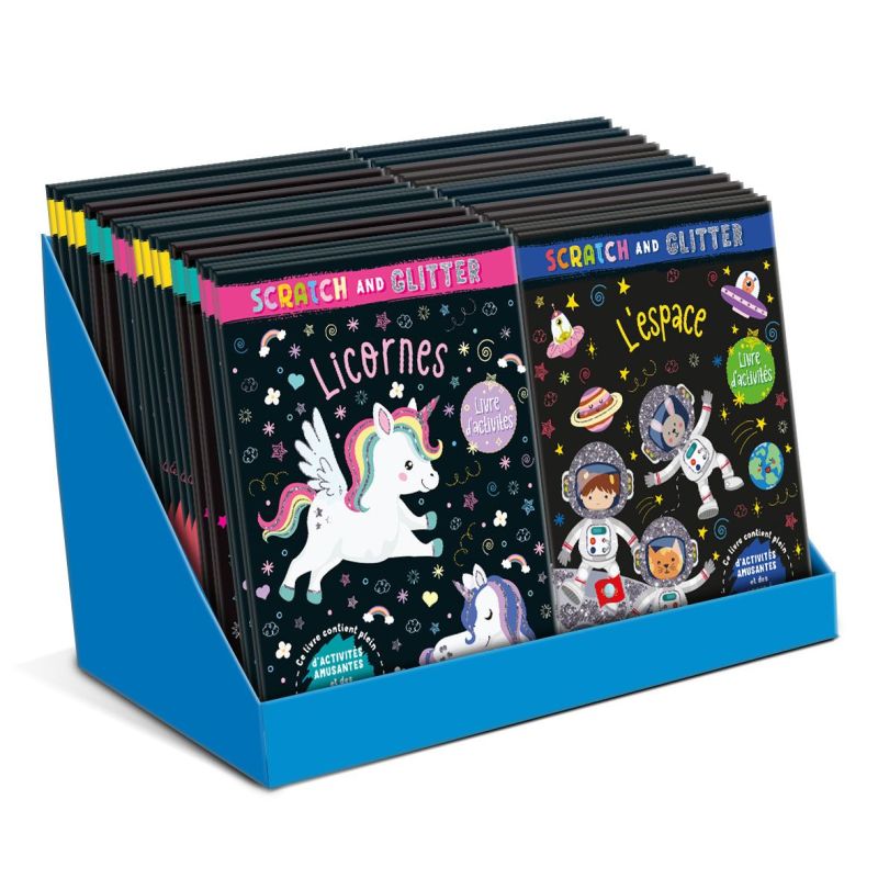 Display de livres dactivités amusantes sur des sujets tels que les dinosaures, les fées et les sirènes, lespace, les licornes, les animaux mignons ou encore les chevaux.