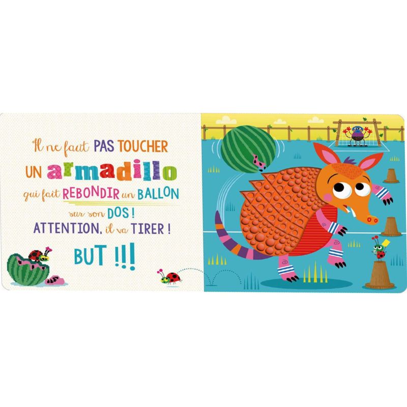 Chaque double-page présente un animal farfelu en pleine action armadillo footballeur, toucan tennisman, jaguar archer et capybara maladroit pour un moment de lecture drôle et interactif.