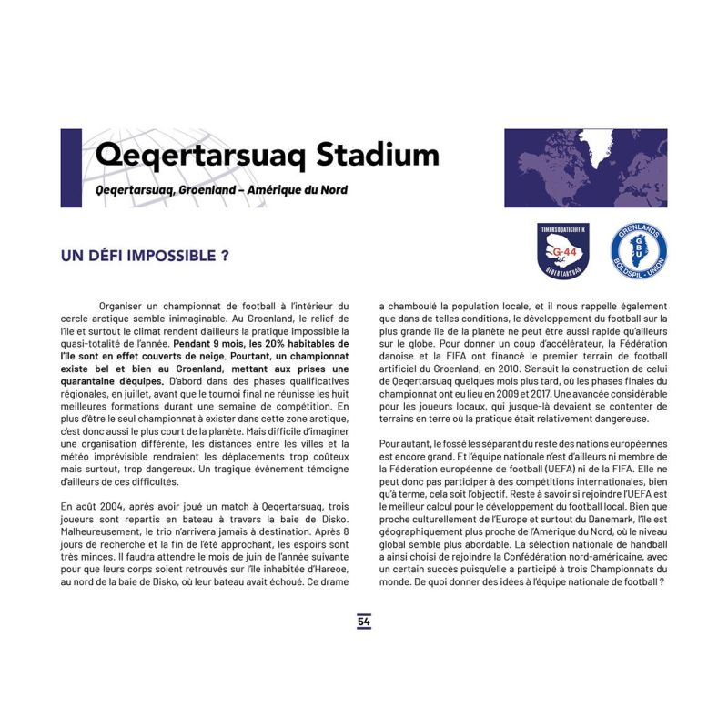 Partez à la découverte des stades de football les plus originaux de la planète ! Du Groenland au sommet du Kilimanjaro, en passant par les Maldives, la Bolivie ou encore le Népal, découvrez 80 terrains de foot qui se distinguent par leur environnement naturel exceptionnel.