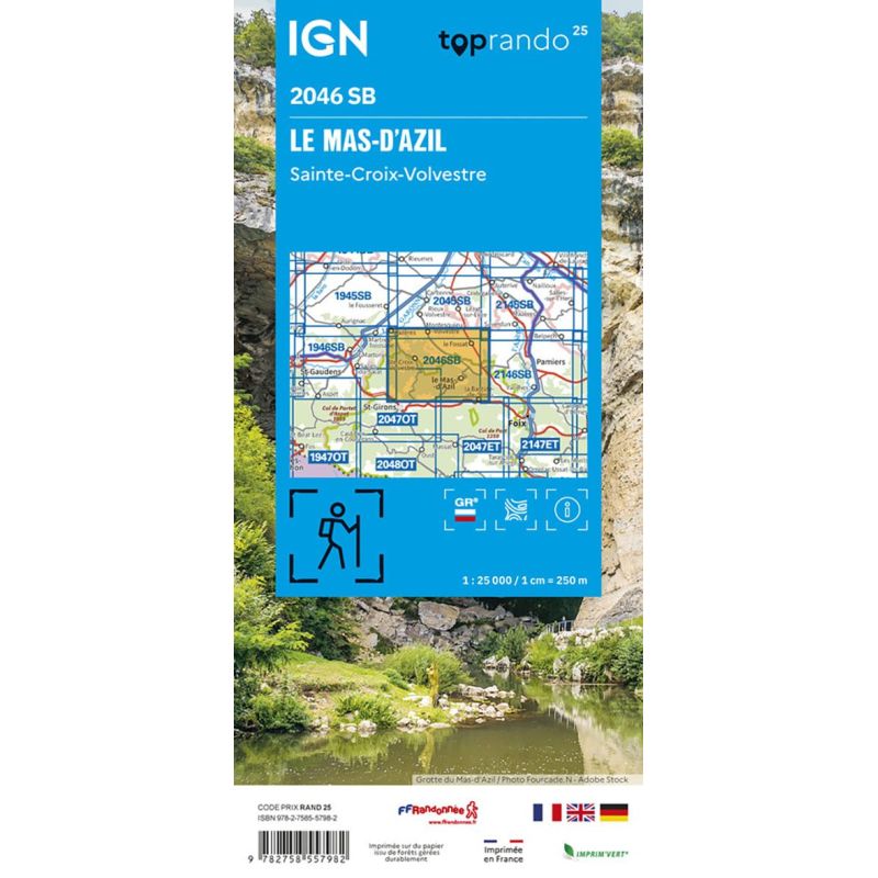 L'indispensable carte de randonnée IGN 2046SB. D'une très grande précision elle contient tous les détails existants sur le terrain : voies de communication jusqu'au moindre sentier, constructions jusqu'au hangar, bois, arbre isolé, rivière, source... Sans oublier la représentation du relief par des courbes de niveau. Les sentiers balisés et les informations touristiques sont également... Lire la suite