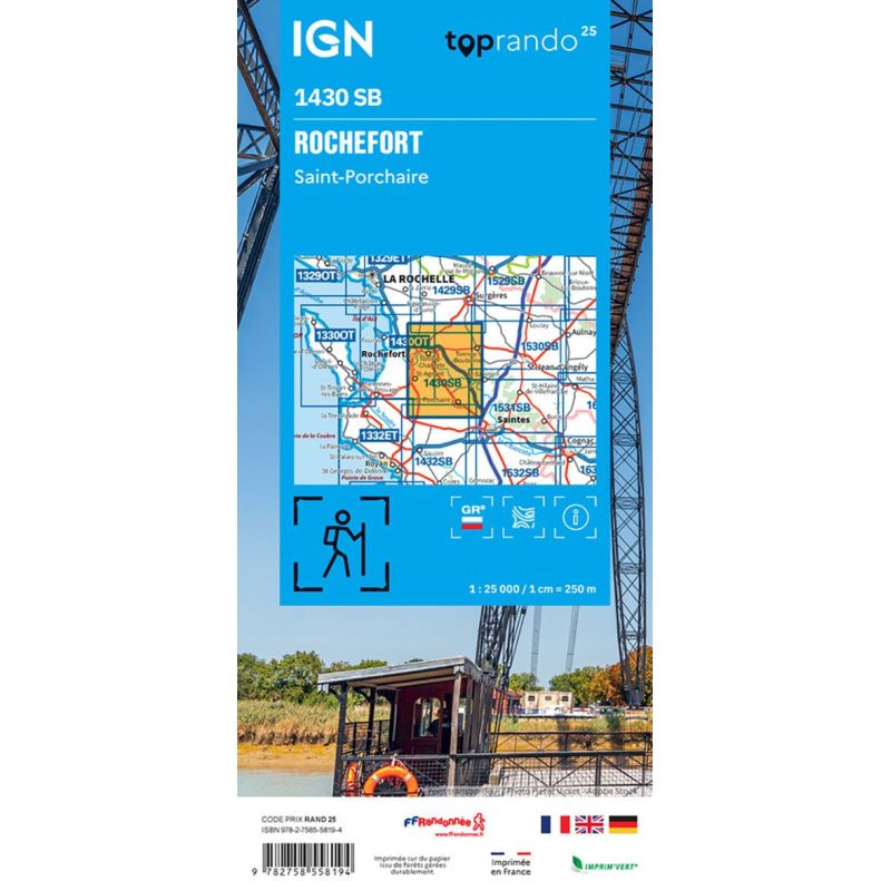 L'indispensable carte de randonnée IGN 1430OT. D'une très grande précision elle contient tous les détails existants sur le terrain : voies de communication jusqu'au moindre sentier, constructions jusqu'au hangar, bois, arbre isolé, rivière, source... Sans oublier la représentation du relief par des courbes de niveau. Les sentiers balisés et les informations touristiques sont également... Lire la suite