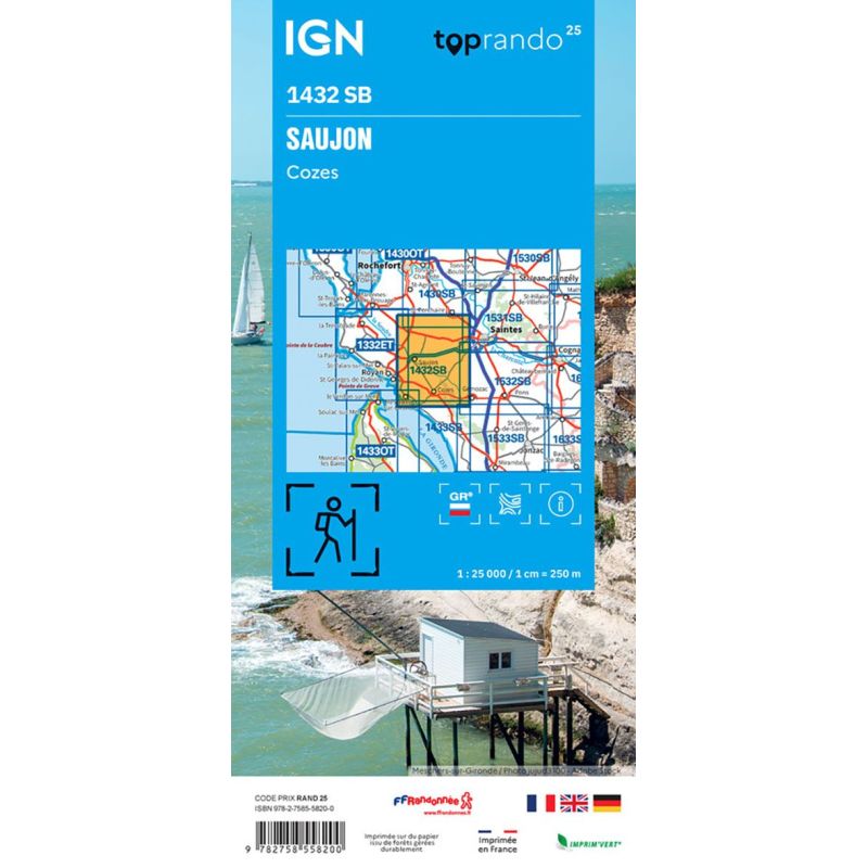 L'indispensable carte de randonnée IGN 1432SB. D'une très grande précision elle contient tous les détails existants sur le terrain : voies de communication jusqu'au moindre sentier, constructions jusqu'au hangar, bois, arbre isolé, rivière, source... Sans oublier la représentation du relief par des courbes de niveau. Les sentiers balisés et les informations touristiques sont également... Lire la suite