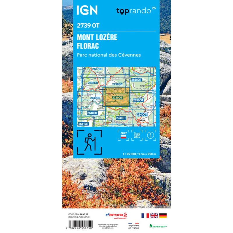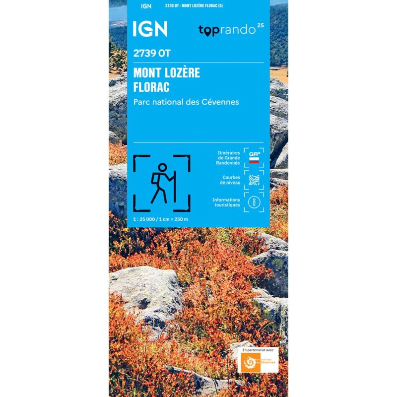 L'indispensable carte de randonnée IGN 2739OT. D'une très grande précision elle contient tous les détails existants sur le terrain : voies de communication jusqu'au moindre sentier, constructions jusqu'au hangar, bois, arbre isolé, rivière, source... Sans oublier la représentation du relief par des courbes de niveau. Les sentiers balisés et les informations touristiques sont également... Lire la suite