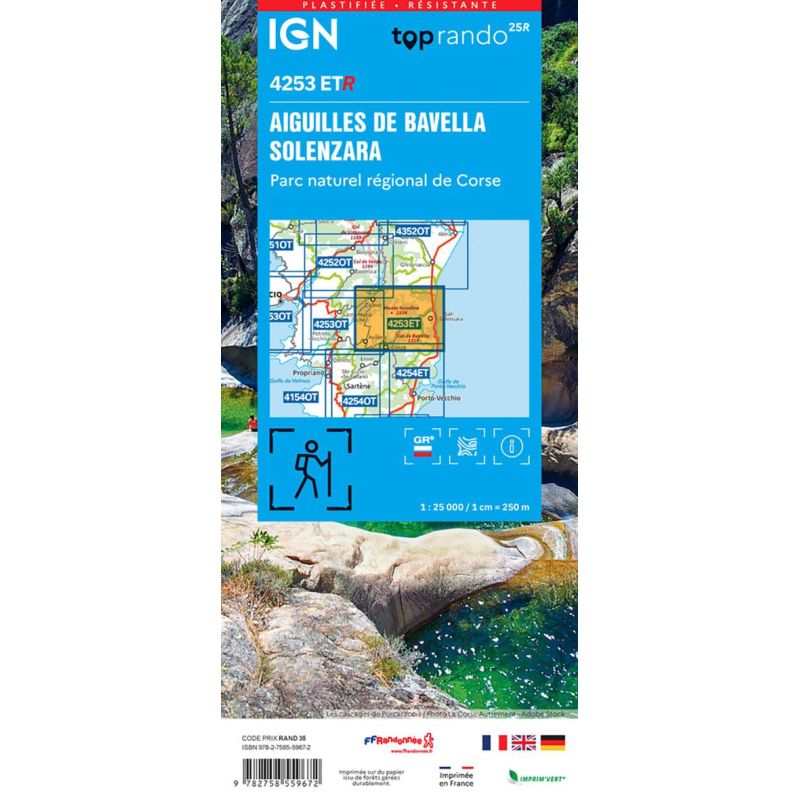 Carte RESISTANTE - Recto/VersoL'indispensable carte de randonnée IGN 4253ETR. D'une très grande précision elle contient tous les détails existants sur le terrain : voies de communication jusqu'au moindre sentier, constructions jusqu'au hangar, bois, arbre isolé, rivière, source... Sans oublier la représentation du relief par des courbes de niveau. Les sentiers balisés et les informations... Lire la suite