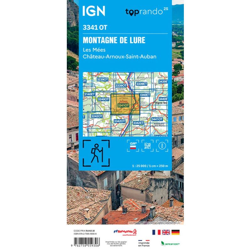 L'indispensable carte de randonnée IGN 3341OT. D'une très grande précision elle contient tous les détails existants sur le terrain : voies de communication jusqu'au moindre sentier, constructions jusqu'au hangar, bois, arbre isolé, rivière, source... Sans oublier la représentation du relief par des courbes de niveau. Les sentiers balisés et les informations touristiques sont également... Lire la suite