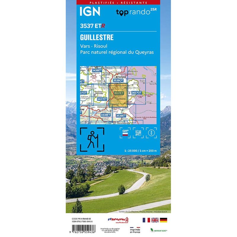 L'indispensable carte de randonnée IGN 3537ETR. D'une très grande précision elle contient tous les détails existants sur le terrain : voies de communication jusqu'au moindre sentier, constructions jusqu'au hangar, bois, arbre isolé, rivière, source... Sans oublier la représentation du relief par des courbes de niveau. Les sentiers balisés et les informations touristiques sont également... Lire la suite