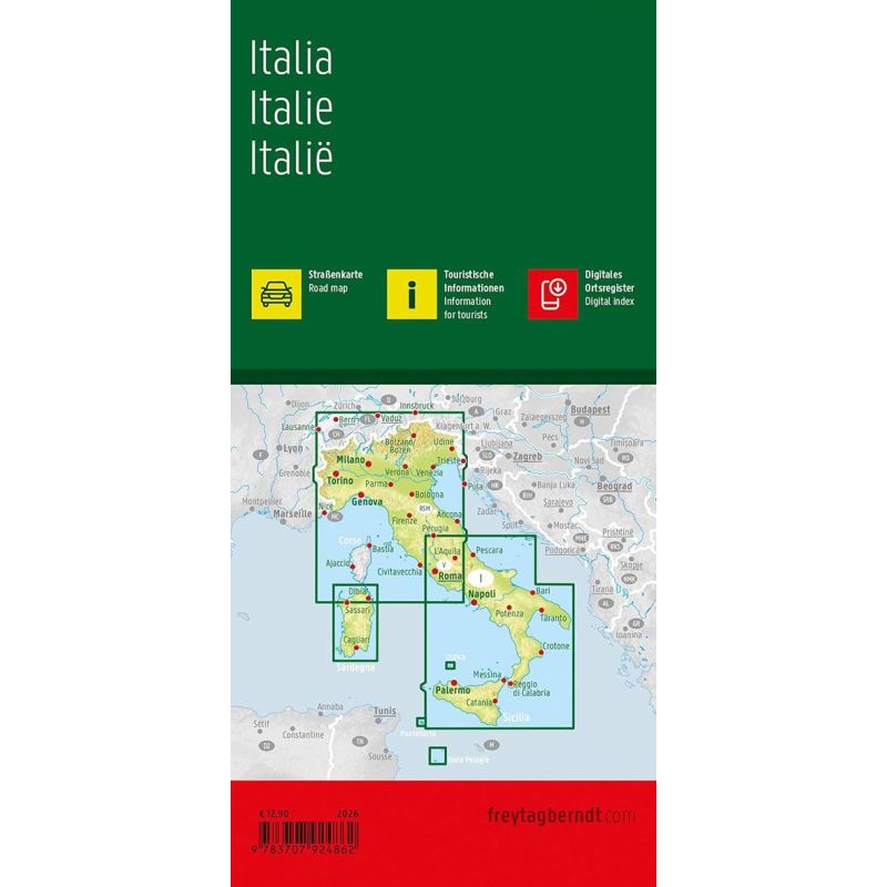 Carte routière de l'Italie publiée par Freytag & Berndt. Echelle 1: 600 000. Mise en valeur des points d'intérêt (sites à voir, parcs nationaux...). Cartographie du relief. Les distances sont indiquées sur la carte.