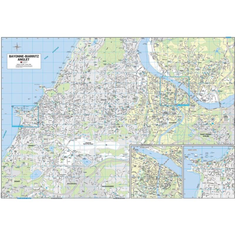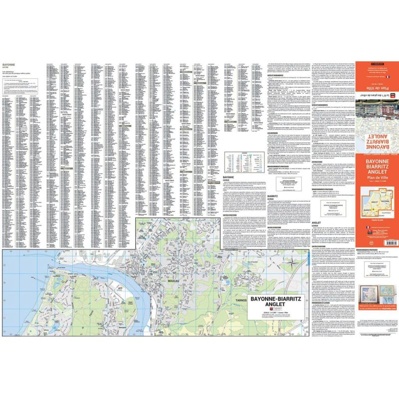 LE PLAN PLUS EN DÉTAIL Le plan de ville de Bayonne Biarritz et Anglet indique les principaux sites et monuments à visiter : BAYONNE : Cathédrale Sainte-Marie, Eglise Saint-André, Eglise Saint-Esprit, Musée Léon Bonnat, Musée Basque, les Jardins Botaniques, le Château Vieux ou encore la Citadelles. BIARRITZ : LEglise Saint-Martin, Le Phare, la Villa Eugénie, le Musée de la Mer, le musée historique de Biarritz. Ce plan de ville contient lensemble des rues avec leur nom, les principaux bâtiments publics et touristiques. Un index complet des rues et des bâtiments vous permet de vous repérer très facilement. Il couvre les communes Bayonne, Biarritz et Anglet.