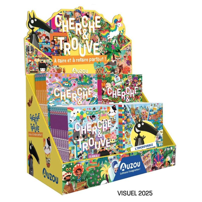 PLV de table des Albums Cherche et Trouve, comprenant les 2 nouveautés :