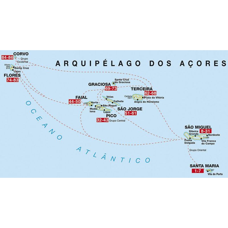 Des promenades agréables longent la côte, des itinéraires de montagne plus exigeants escaladent le Pico, le plus haut sommet du Portugal. On traverse une nature intacte avec une diversité de plantes inouïe et de hauts volcans, accompagnés du parfum des fleurs et des vapeurs de soufre. Ici, le feu couve sous le sol, si fort quon peut faire la cuisine dans des trous creusés dans la terre. Des sources soufrées bouillonnantes, des fumerolles et des lacs deau thermale témoignent de lactivité des volcans. Dinnombrables vallées profondes découpent la pierre volcanique, le bleu profond des lacs de cratère étincèle. De nombreux points de vue offrent des panoramas époustouflants sur des cratères, des lacs, de doux paysages de collines ou le littoral à la forme bizarre, encadré par l'immensité de locéan.