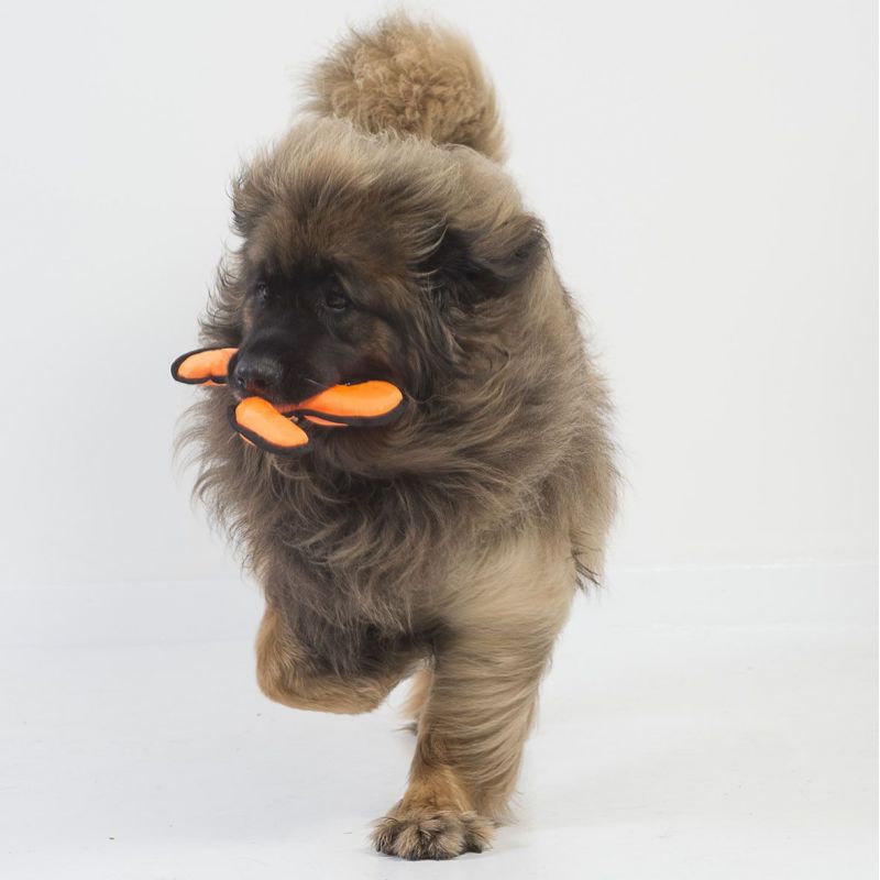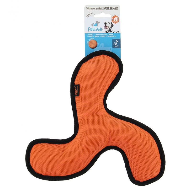 Triskèle Fidelami, un jeu à lancer et rapporter pour chien de toute taille. Forme adaptée à toutes les mâchoires. Peut-être mâché, satisfait le besoin de mastication. Avec un couineur. Facile à nettoyer.