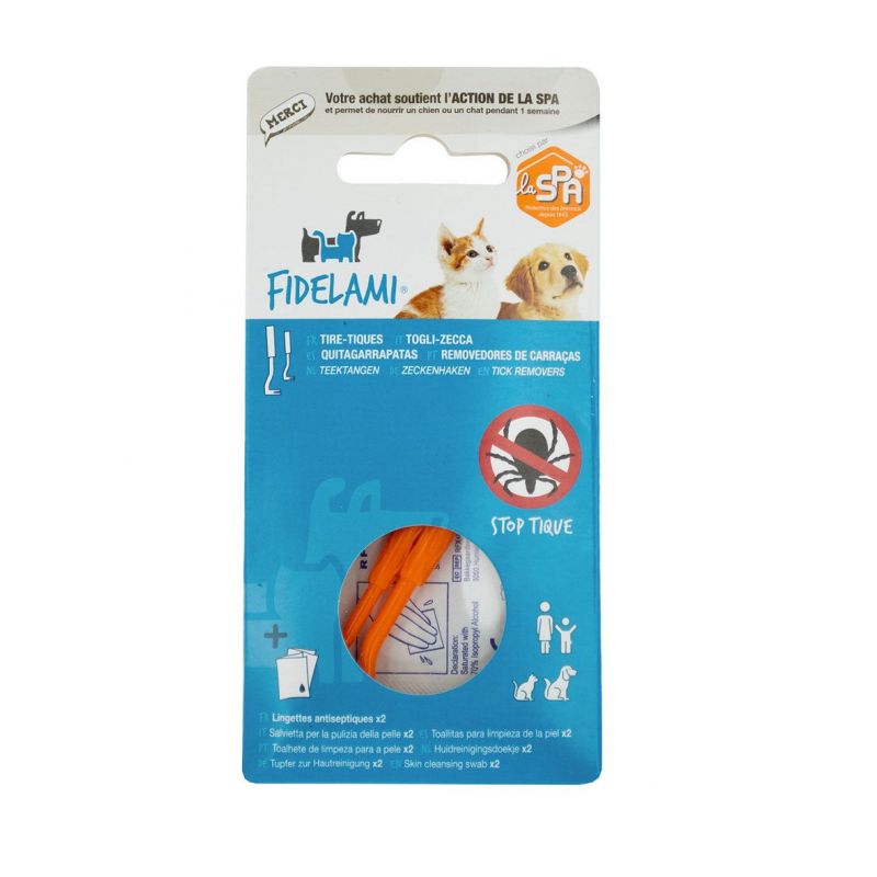 Kit 2 tire-tiques et 2 lingettes désinfectantes Fidelami . L indispensable tire-tique pour retirer manuellement la totalité du parasite fixé sur le corps de nos animaux. En forme de pied de biche, à utiliser en rotation, dans le sens inverse des aiguilles d'une montre. 2 tailles disponibles : pour gros et petit tiques.