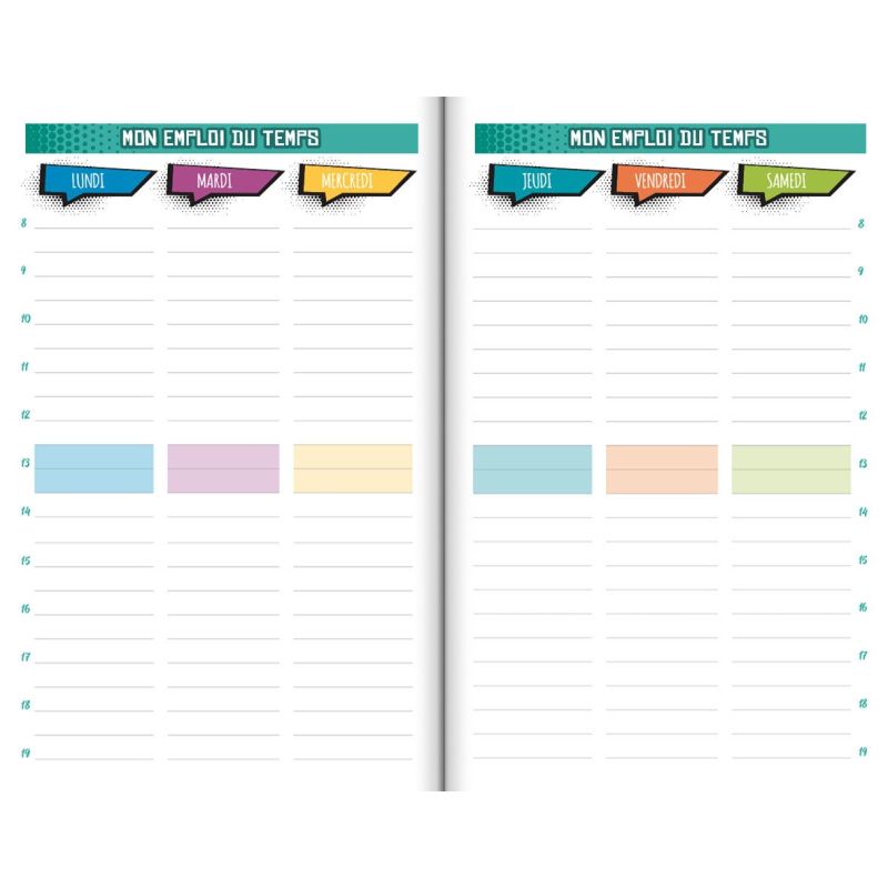 Inclus : emploi du temps et liste professeurs à compléter, calendrier 2026/2027, vacances scolaires, 1 page par jour.